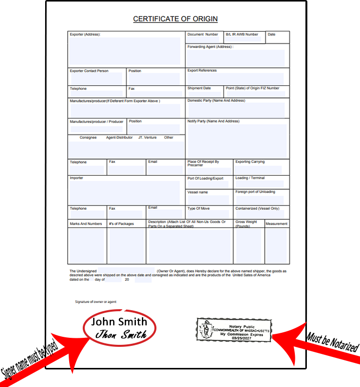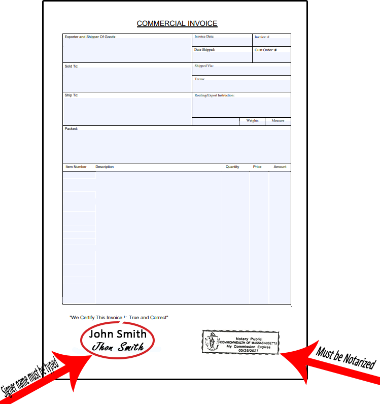 Commercial Invoice, Certificate of origin, and Packing List must be signed and notarized by a local notary public.